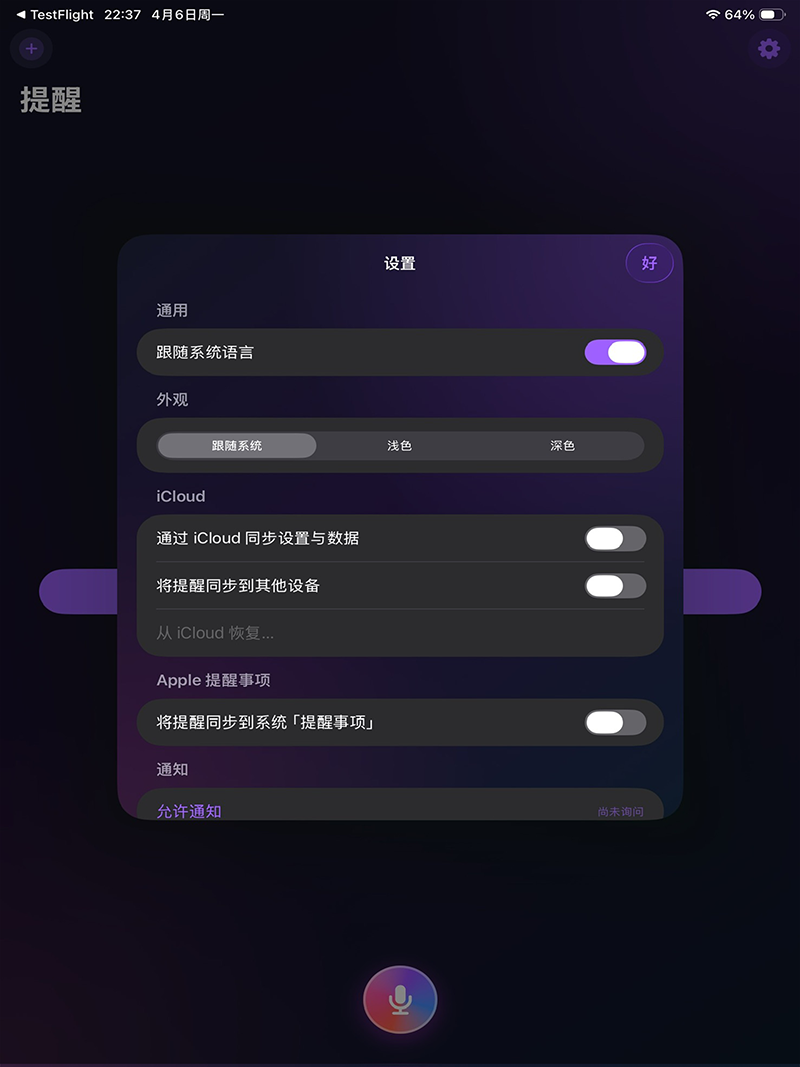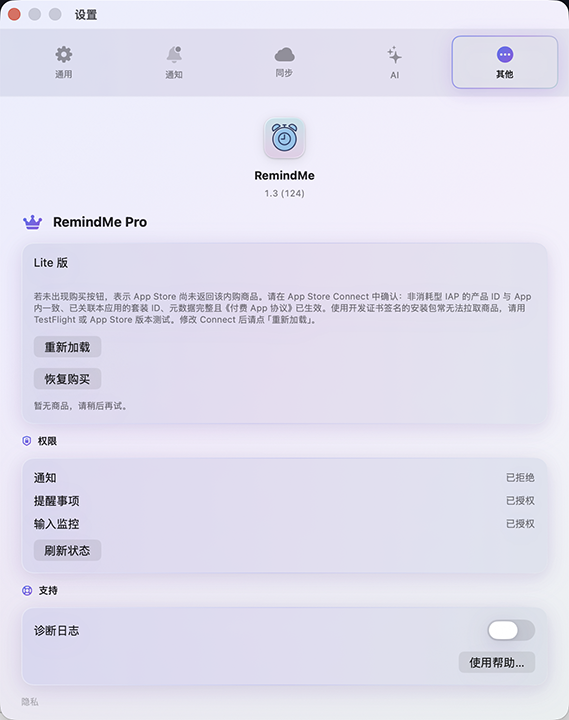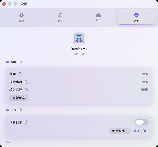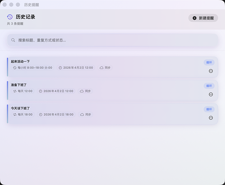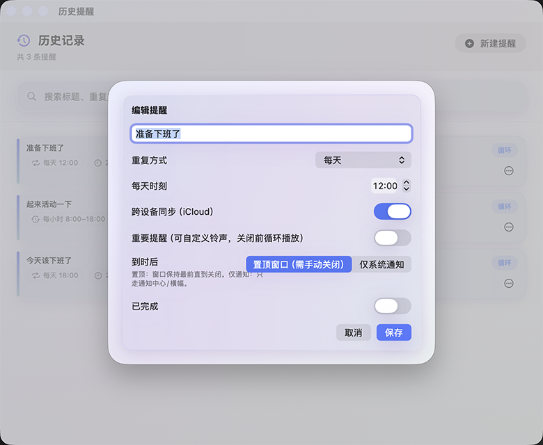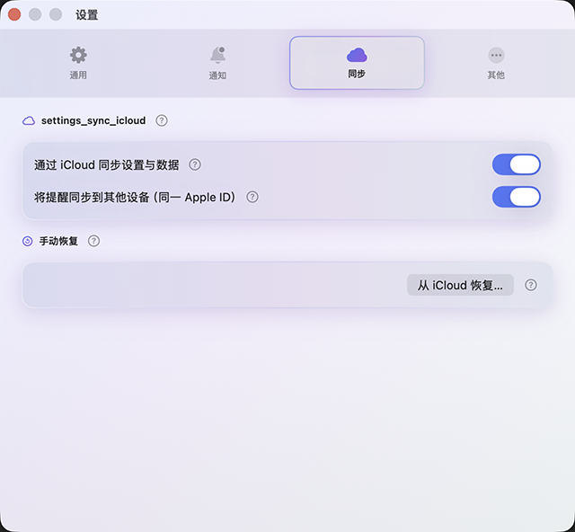 Optional mirror to Apple Reminders. Premium syncs data and preferences across Mac, iPhone, and Apple Watch via iCloud.