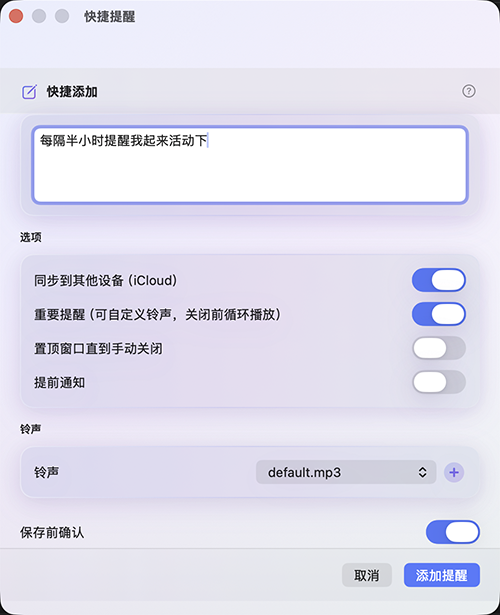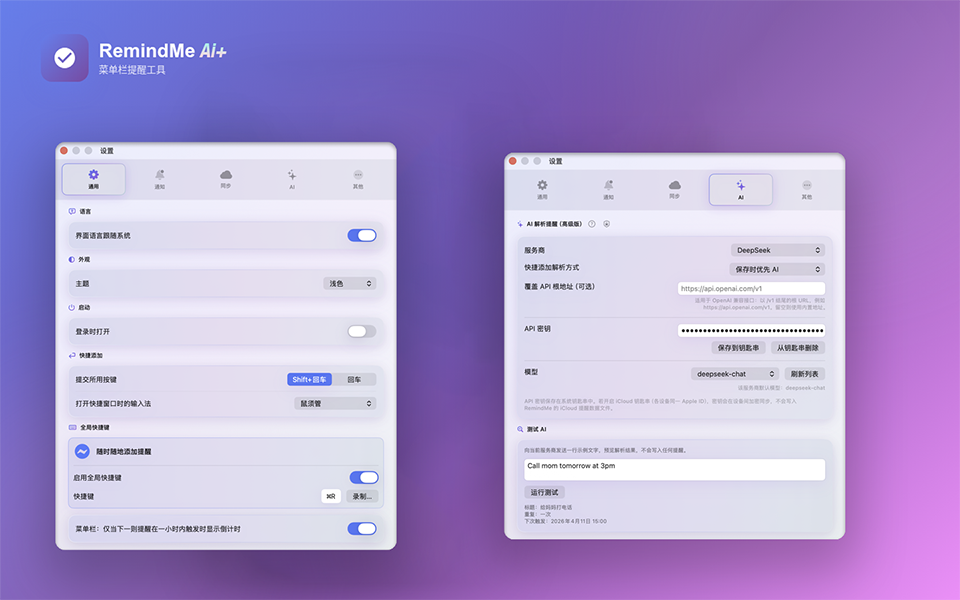 Write when, what kind of reminder, and what to tell yourself—in rich Chinese or English phrasing. In-app help lists examples and full rules.